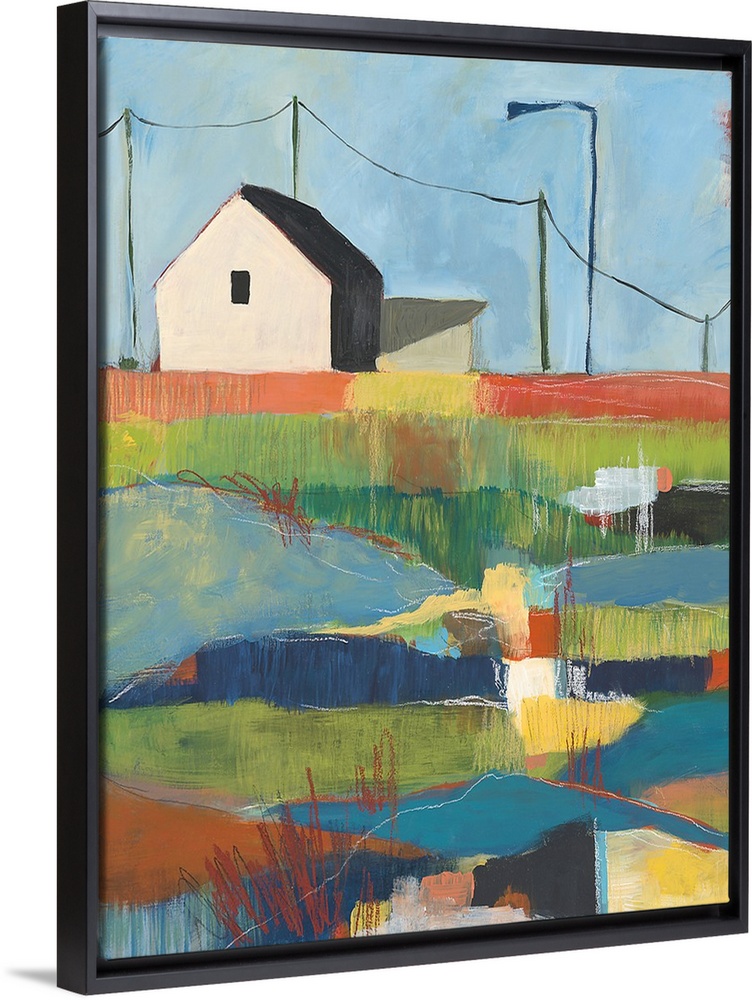 <p>Colorful landscape painting of a black and white house on top of a hill.</p>