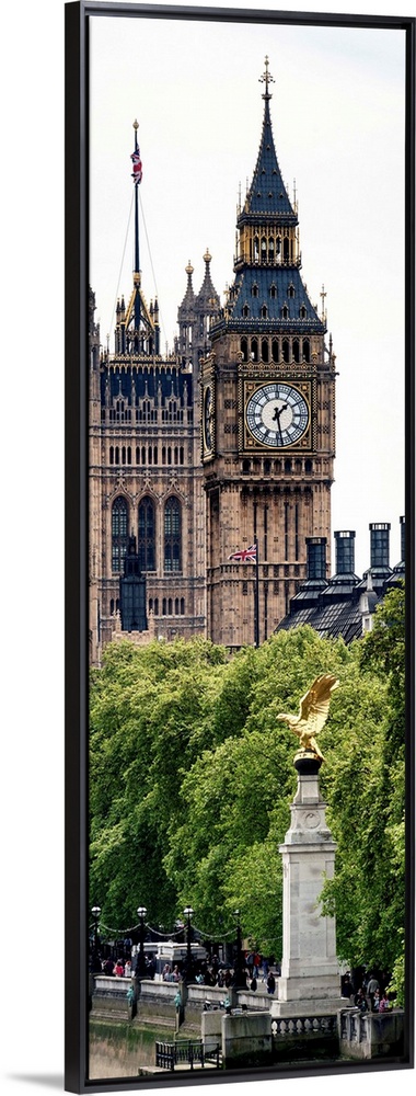 <p>Vertical panoramic photo of the Big Ben clock tower with a statue in the foreground.</p>