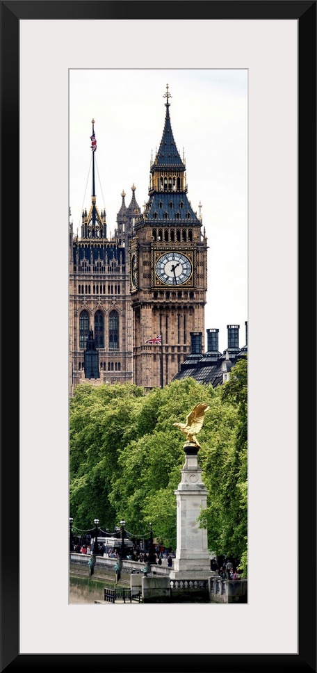 <p>Vertical panoramic photo of the Big Ben clock tower with a statue in the foreground.</p>