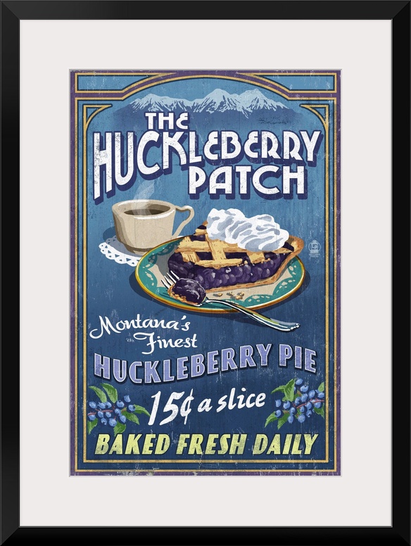 <p>Retro stylized art poster of a vintage sign advertising a slice of huckleberry pie and cup of coffee.</p>