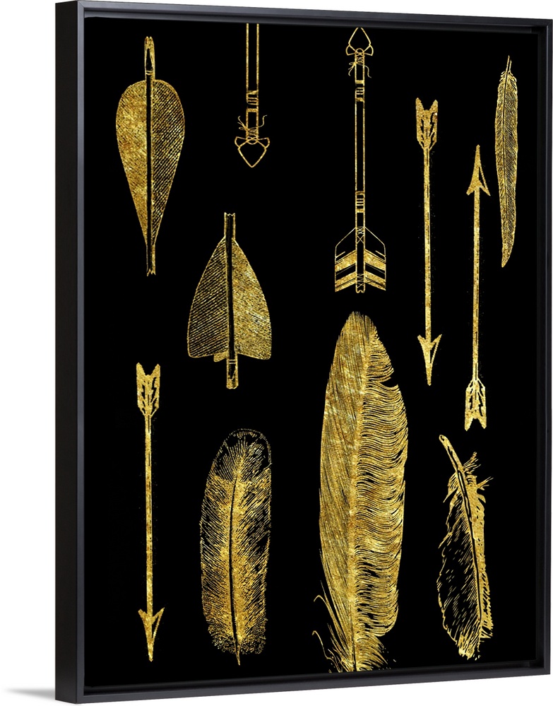 <p>An assortment of feathers and arrows in gold on black.</p>