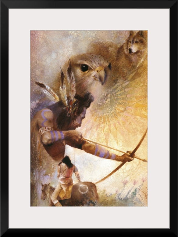 <p>A contemporary painting of a Native American man pulling back on a bow about to release an arrow, while a wolf and falcon are seen in the top of the image.</p>