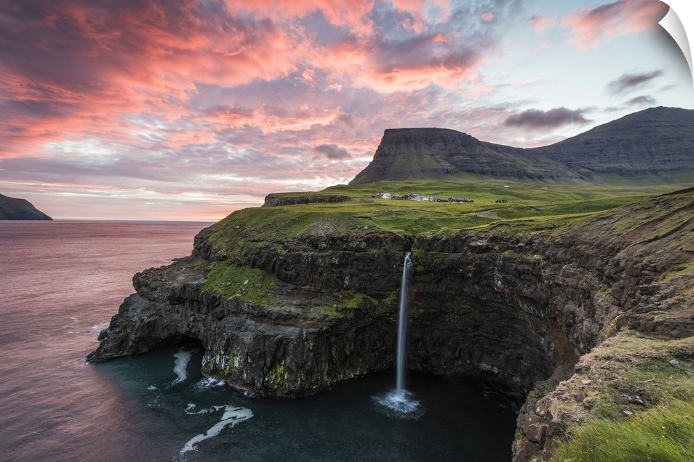 <p>Gasadalur, Vagar island, Faroe Islands, Denmark. The iconic waterfall jumping from the cliff into the ocean at sunset.</p>