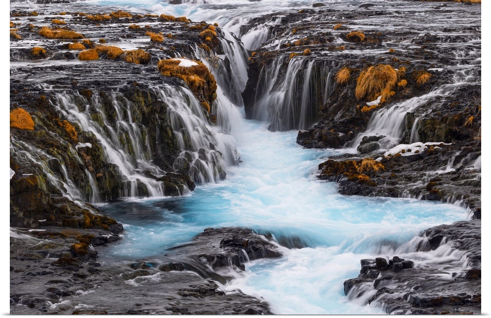 <p>The incredibly colorful details of the famous Bruarfoss waterfall, with its turquoise water and golden grass, taken on a cold winter day, Iceland, Polar Regions</p>
