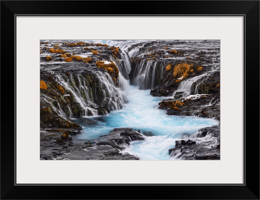 <p>The incredibly colorful details of the famous Bruarfoss waterfall, with its turquoise water and golden grass, taken on a cold winter day, Iceland, Polar Regions</p>