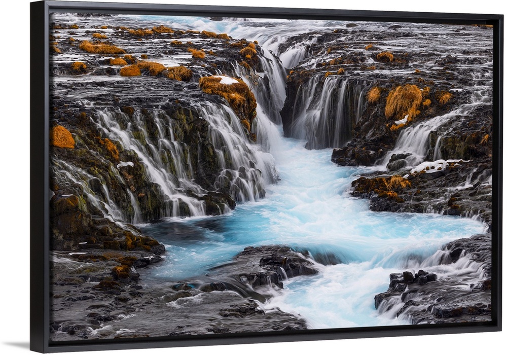 <p>The incredibly colorful details of the famous Bruarfoss waterfall, with its turquoise water and golden grass, taken on a cold winter day, Iceland, Polar Regions</p>