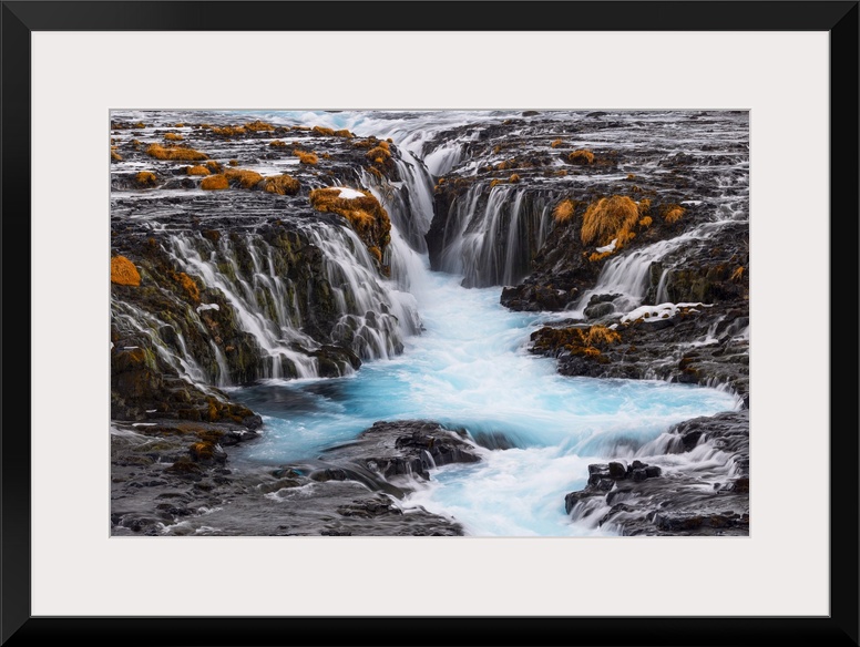 <p>The incredibly colorful details of the famous Bruarfoss waterfall, with its turquoise water and golden grass, taken on a cold winter day, Iceland, Polar Regions</p>