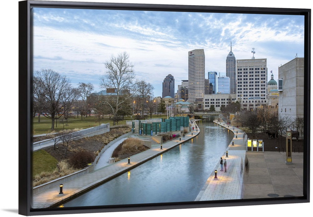 <p>Waterway through the city of Indianapolis, Indiana, just before sunset.</p>