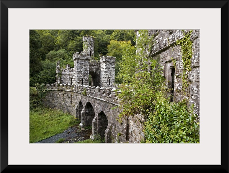 <p>A side angle view of a large stone bridge and towers that are surrounded by greenery in Ireland.</p>
