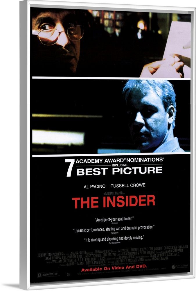 <p>Riveting and controversial film that caused a real-life snit at 60 Minutes over the facts and portrayals in the story. After Jeffrey Wigand (Crowe) is fired from his top-level tobacco company job, he turns whistleblower, claiming his former employers lied about the dangers of cigarettes. Veteran 60 Minutes producer Lowell Bergman (Pacino) and newsman Mike Wallace (Plummer) pursue the story--only to be shot down by their own network. The fallout causes ethical consequences for all involved. Performances are outstanding--from the chameleon Crowe to the relatively subdued Pacino and the slyly pompous Plummer. Based on a Vanity Fair magazine article.</p>