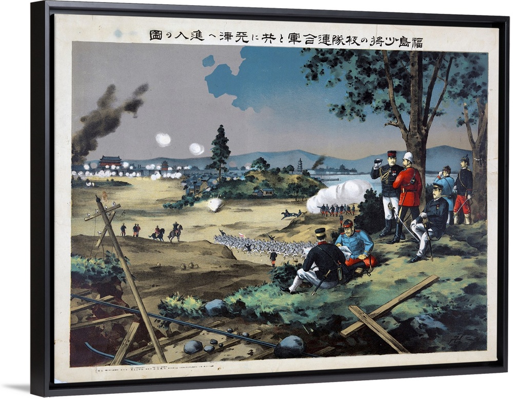 <p>Woodcut illustration showing the Japanese commander, Major General Fukushima, holding binoculars, standing with a British commander and other officers, as the allied troops attack the walled city of Tianjin, China.</p>