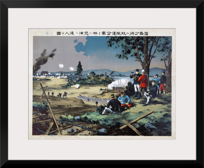 <p>Woodcut illustration showing the Japanese commander, Major General Fukushima, holding binoculars, standing with a British commander and other officers, as the allied troops attack the walled city of Tianjin, China.</p>