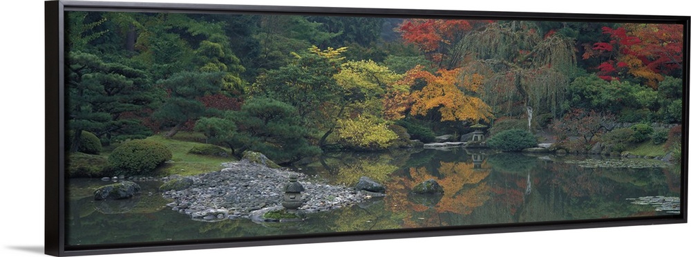 <p>Giant panoramic photo of the Japanese Garden in Seattle, Washington (WA) with trees and stones lining a body of water. Green trees on the left are contrasted by trees with changing autumn leaf colors on the right.</p>