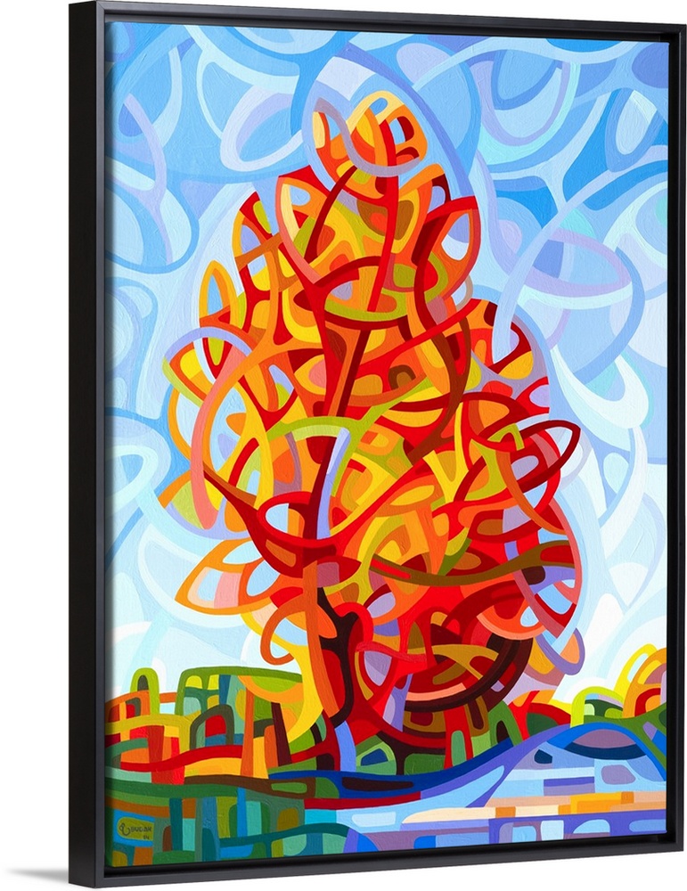 <p>Mandy Budan’s art style is more than unique. Using acrylic colors to weave lines and shapes together like a tapestry, she creates breathtaking images from the simplest forms. Though the multicolored dots of “Standing Room Only” may seem like a scattering of disparate, broken circles up close, a step back reveals a stunning forest scene reminiscent of stained glass. In “Solitaire,” a close examination reveals an intricate collection of interlocking pieces, almost like peeking at the delicate harmony of gears in a pocket watch. Yet again, a step away from the canvas transforms her design into an unrestricted dance of fluid lines and curves in a blossom. Whether it’s the soft floral pinks of “Cascade,” the gold turning crimson in “Stormlight,” or the sweeping blues of “Thaw,” wall art from Mandy Budan adds more than color to a room; it invites visitors to discover something new each time they encounter it.</p>