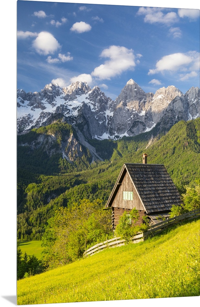 <p>Slovenia, Gorenjska Region, Kranjska Gora. The Julian Alps and the pyramid like peak of Spik seen from the small village of Srednji Vrh.</p>