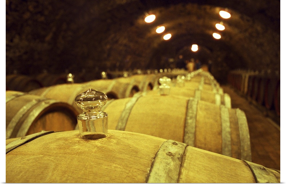 <p>The Kiralyudvar winery in Tarcal: in the underground cellar, rows of barrels with Tokaj wine aging. Traditional glass bung hole stoppers. Kiralyudvar (meaning ...King...s Court...)is run by Istvan Szepsy, considered maybe the best winemaker in Tokaj. he also makes Tokaj under his own name. Credit Per Karlsson BKWine.com</p>