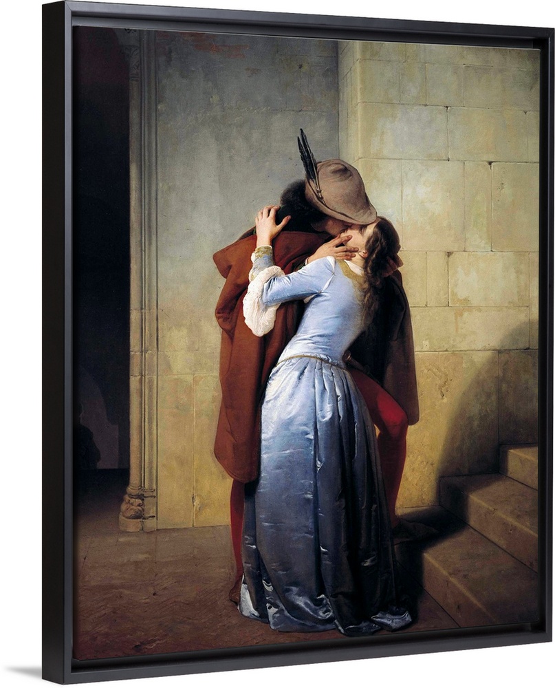 <p>19th century classic painting of a man kissing a woman in a stone hallway.</p>
