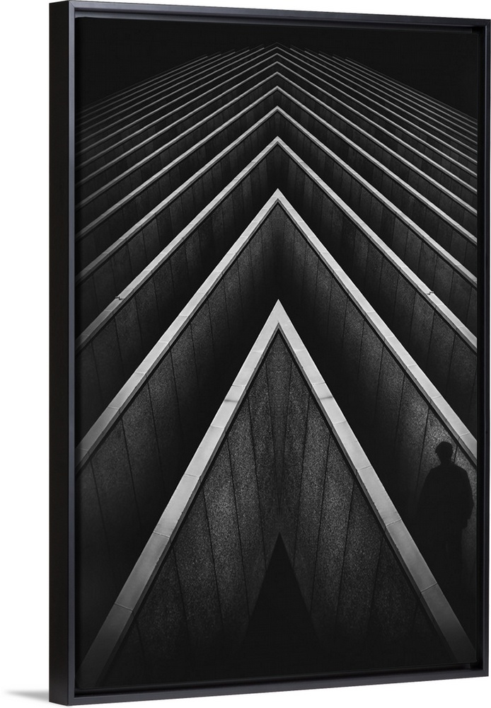 <p>Angular walls forming an abstract pattern, with the shadow of a person.</p>