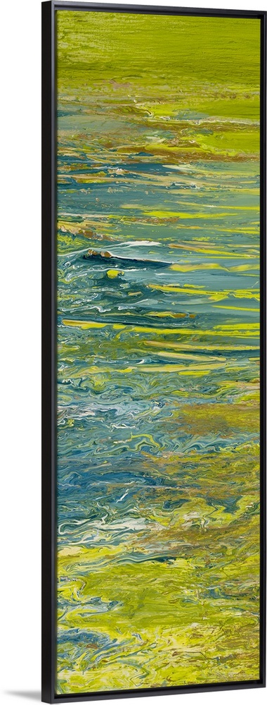 <p>Vertical, big canvas art of cool and golden tones swirling together like fluid.</p>
