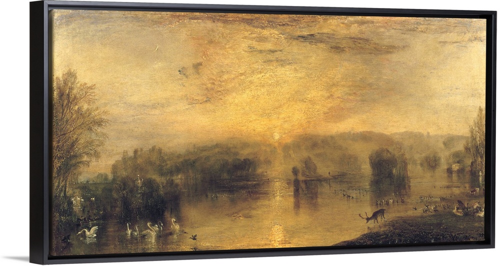 <p>BAL75938 The Lake, Petworth: Sunset, a Stag Drinking, c.1829 by Turner, Joseph Mallord William (1775-1851); oil on canvas; 63.5x132.1 cm; Petworth House, Sussex, UK; English, out of copyright</p>