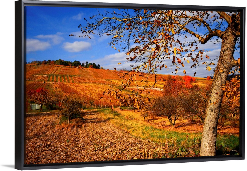 <p>Large artwork showing a tree during the autumn that has lost many of its leaves with farmland that goes back as far as you can see.</p>