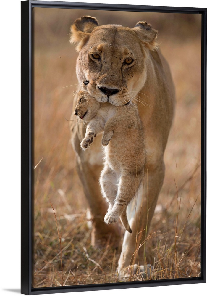 <p>A lioness carrying her cub by the scuff of the neck.</p>