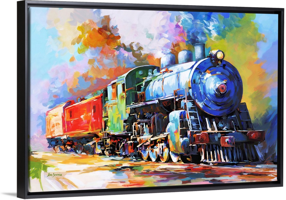 <p>This vibrant artwork captures a steam locomotive train in full motion, billowing clouds of smoke into the colorful sky. The bold brushstrokes and vivid colors bring the scene to life, evoking the power and nostalgia of classic trains.</p>