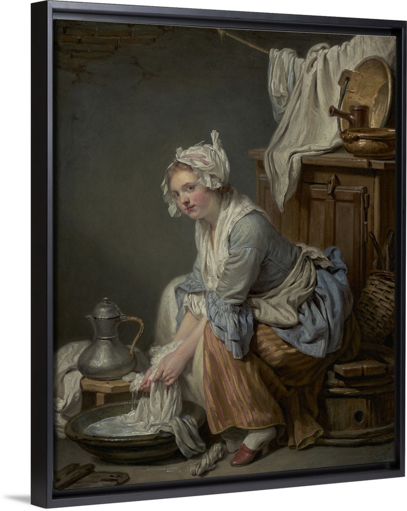 <p>The Laundress, by Jean-Baptiste Greuze, 1761, French painting, oil on canvas. The moralizing artist Greuze portrays maidservant with an exposed stocking and slipper, and a provocative gaze. Greuze gives the painting sensuality, rather of a depiction of vi</p>