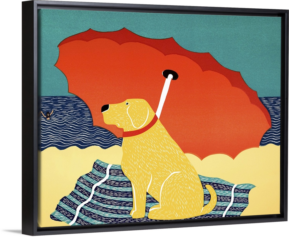 <p>Illustration of a yellow lab sitting on under a beach umbrella at the beach watching his owner swim.</p>