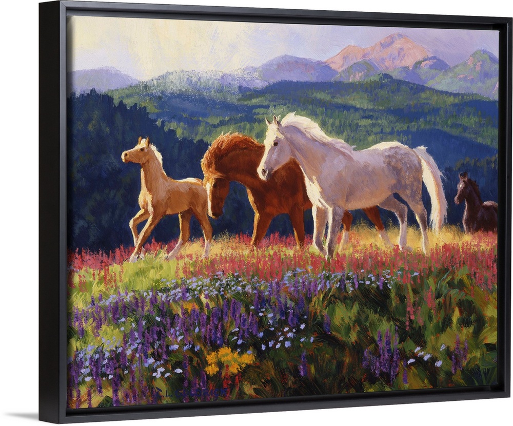 <p>Contemporary colorful painting of a herd of horses running through a meadow, with a mountain range in the background.</p>