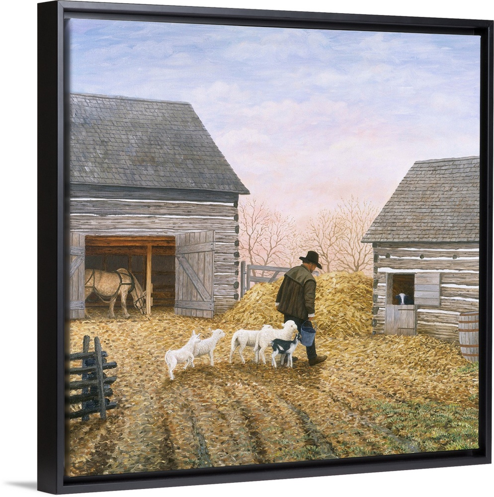 <p>Contemporary artwork of a farmer with his sheep between two farm buildings.</p>