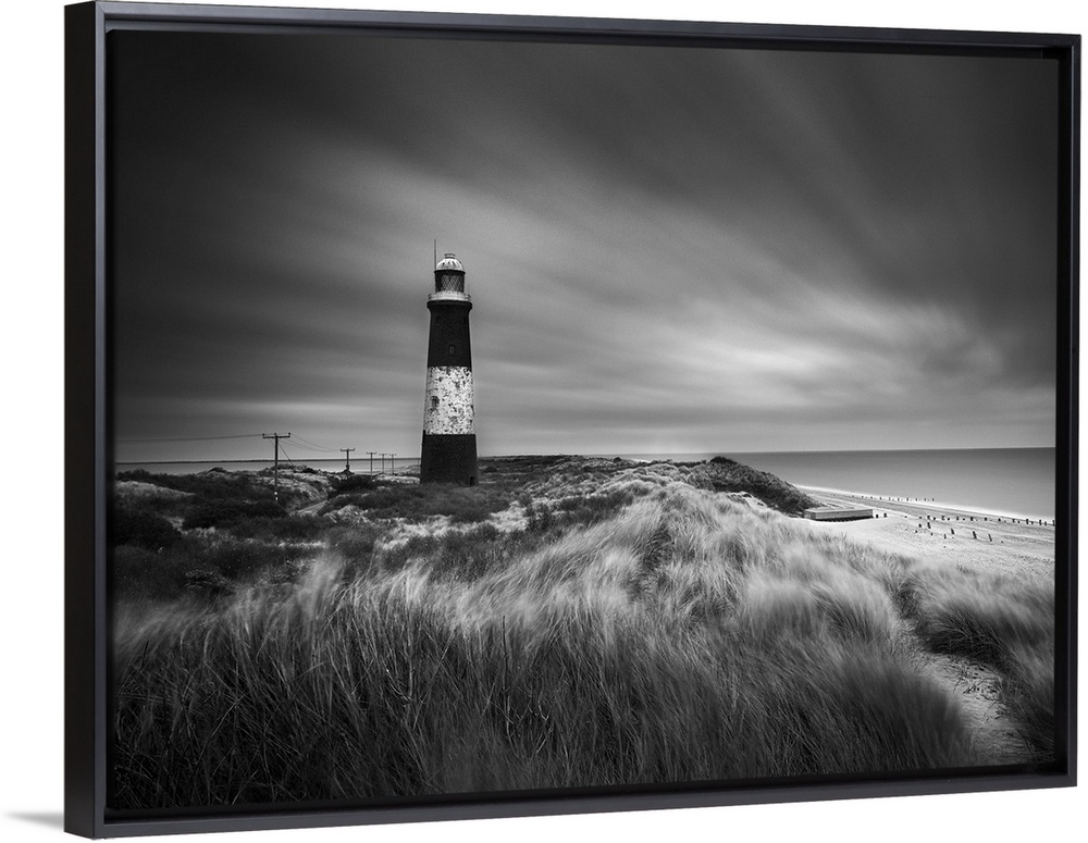 <p>Fine art photo of a striped lighthouse on the coast near grassy dunes.</p>