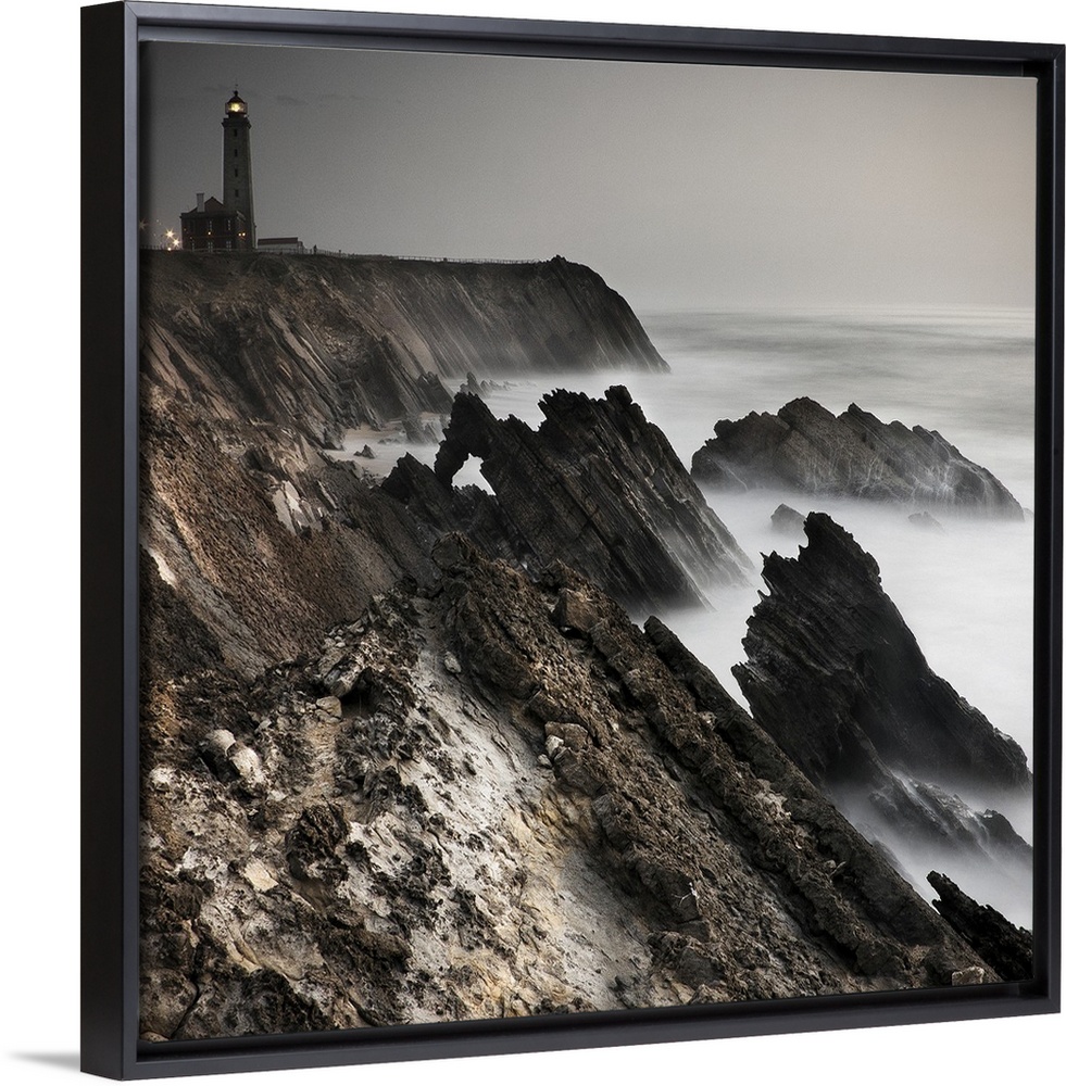 <p>Dynamic photograph of a lighthouse on a foggy jagged rocky coast.</p>