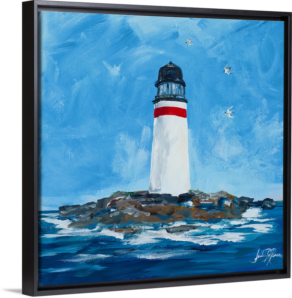 <p>Contemporary square painting of a white lighthouse with one red strip at the top on an island surrounded by the ocean and seabirds.</p>