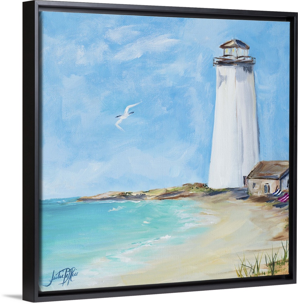 <p>Square painting of an all white lighthouse on the shore with a seabird flying above the ocean.</p>