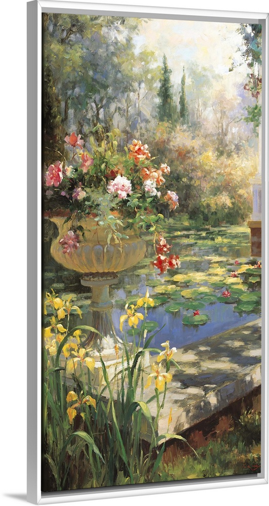 <p>Painting of a pond in a garden with an urn full of flowers.</p>