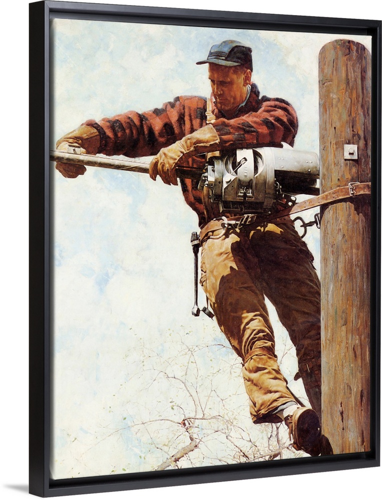 <p>Norman Rockwell's paintings and illustrations are popular for their reflection of American culture. His artwork depicts traditional home and family life while evoking a sense of nostalgia in its viewers and utilizing humor to provide an escape from the mundane. Alternate Title: Telephone Lineman on Pole. Approved by the Norman Rockwell Family Agency</p>