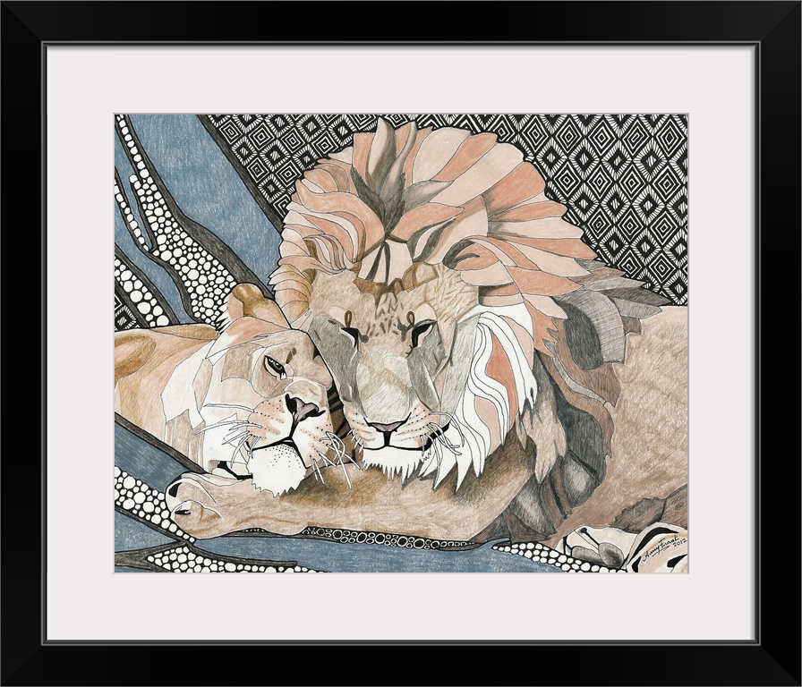 <p>Illustration of a lion and lioness snuggling with a patterned background.</p>