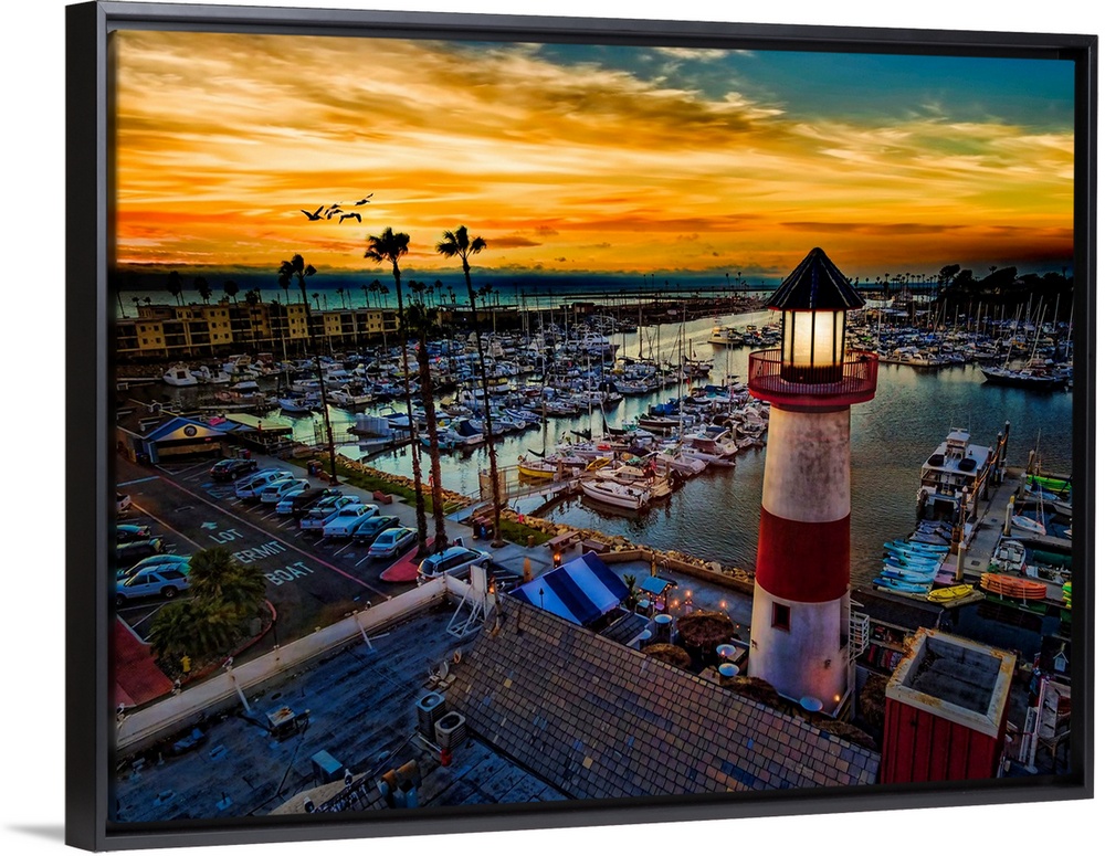<p>Pelicans glide over the Oceanside Harbor and the little lighthouse glows. Colorful sunset in Oceanside, California, USA.</p>