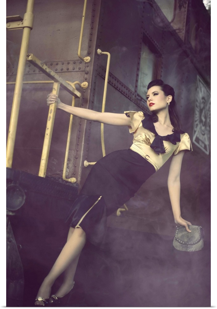 <p>A young vintage 1940s pinup hangs off the side of a smoky train.</p>