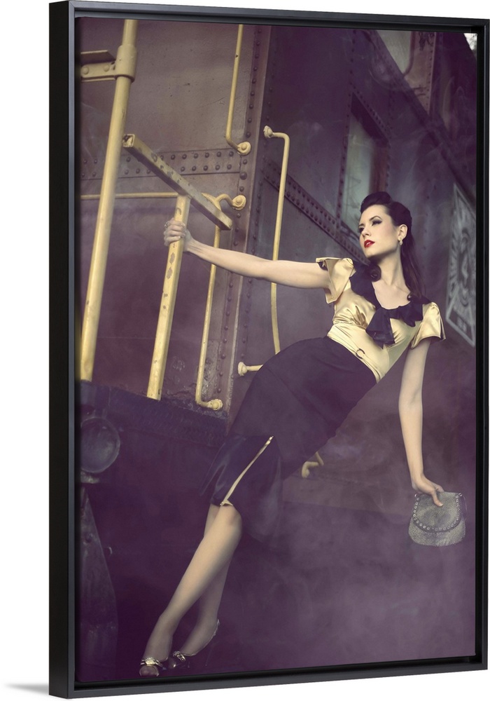 <p>A young vintage 1940s pinup hangs off the side of a smoky train.</p>