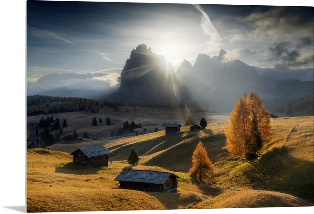 <p>The lonely cabins of the Alpe di Siusi (Seiser Alm) during a sunny autumn morning, with the mountains in the background. Dolomites, Italy.</p>