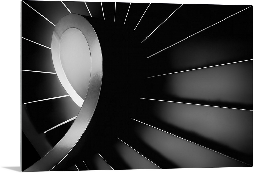 <p>Black and white image of a dark spiral staircase, seen from above.</p>