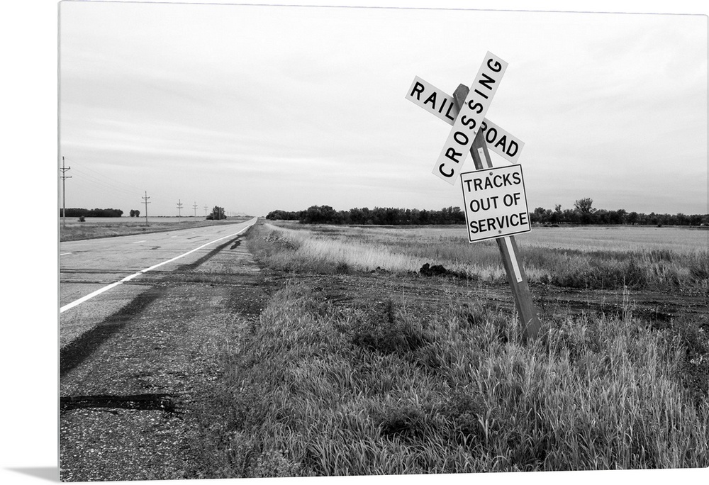 <p>Road sign by disused railroad in Bottineau County USA</p>
