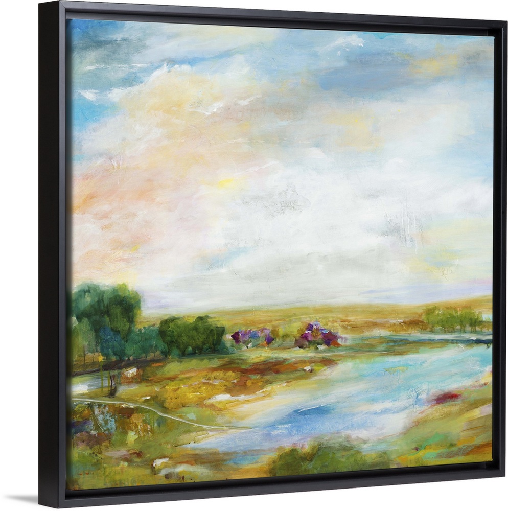 <p>Contemporary landscape painting looking out over a countryside pond.</p>