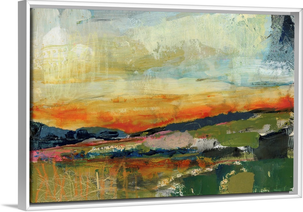 <p>A bright, contemporary abstract painting resembling a landscape at sunset</p>
