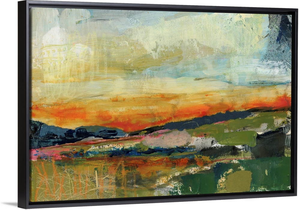 <p>A bright, contemporary abstract painting resembling a landscape at sunset</p>