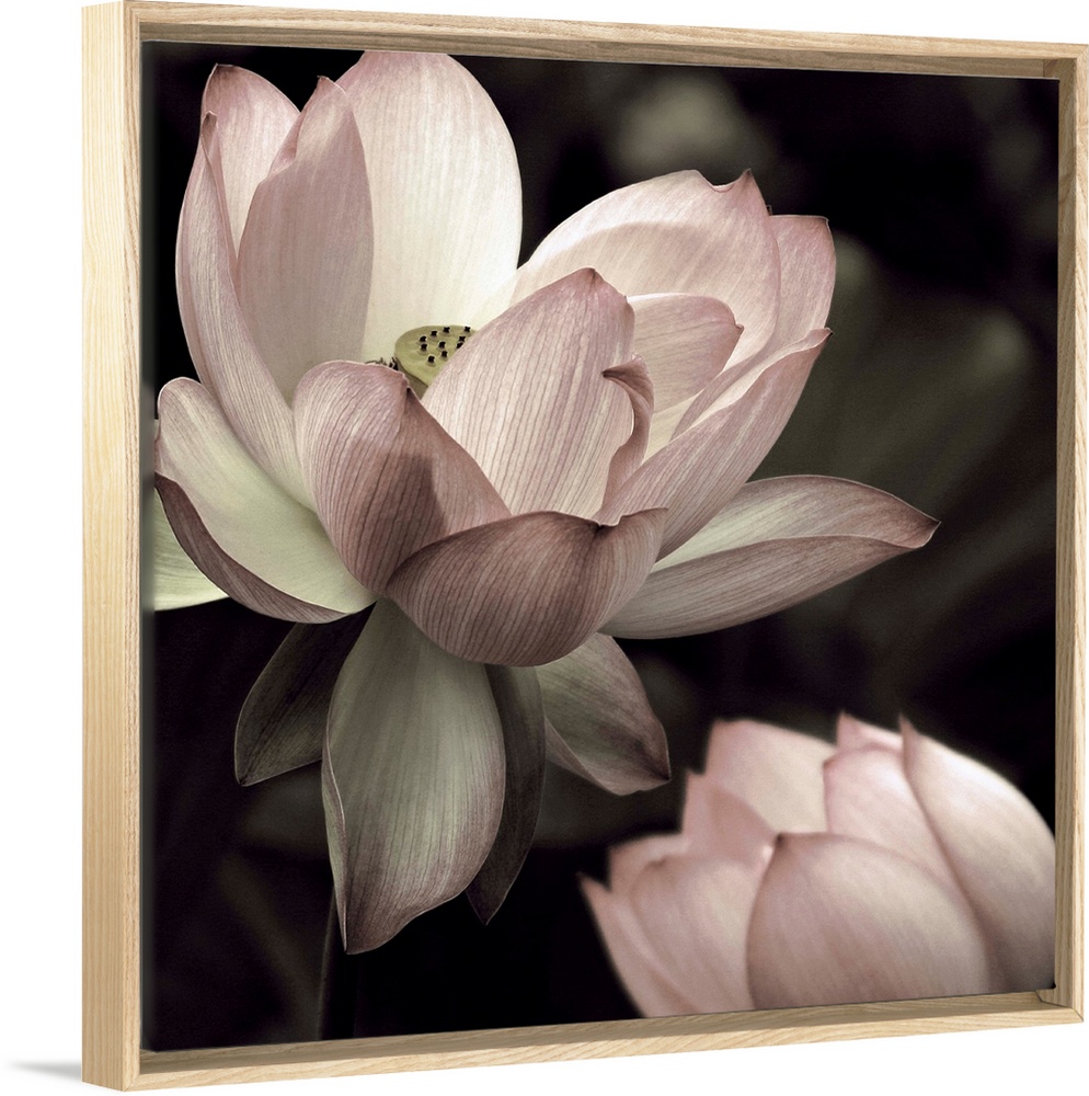 <p>Square photograph of two lotus flowers in muted pink, green, and white hues.</p>