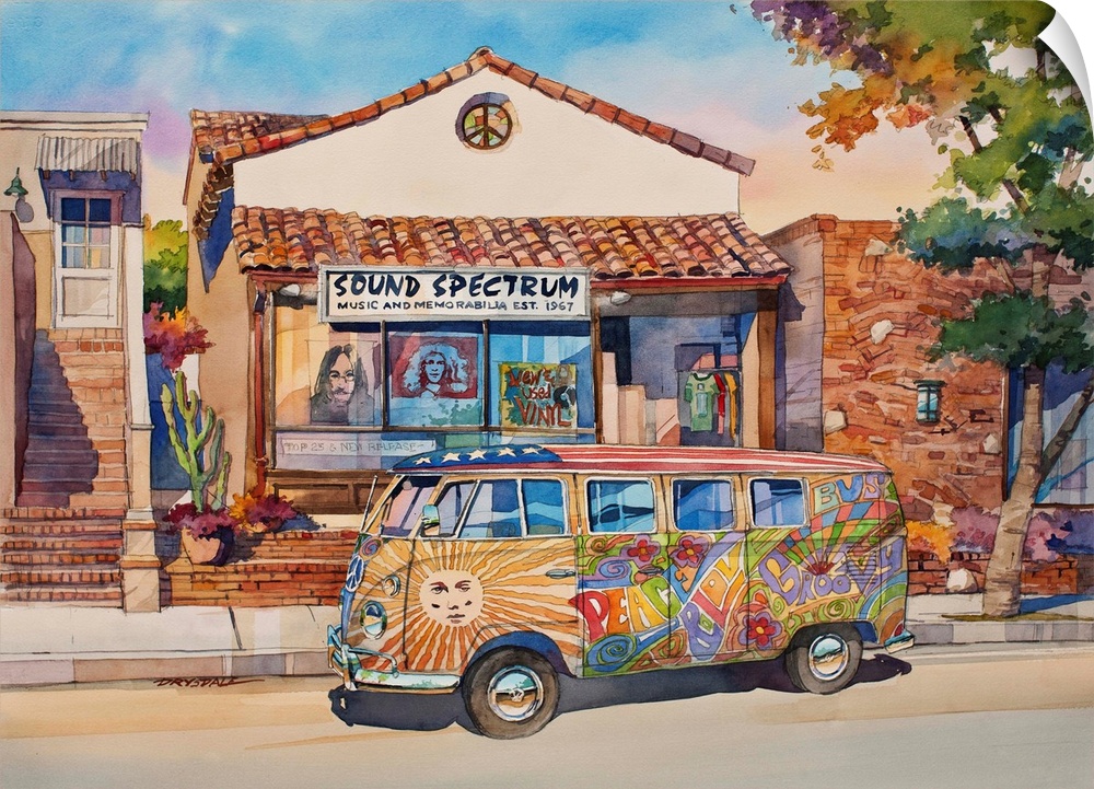 <p>Watercolor painting of a painted VW Bus parked in front of Sound Spectrum music and memorabilia store.</p>