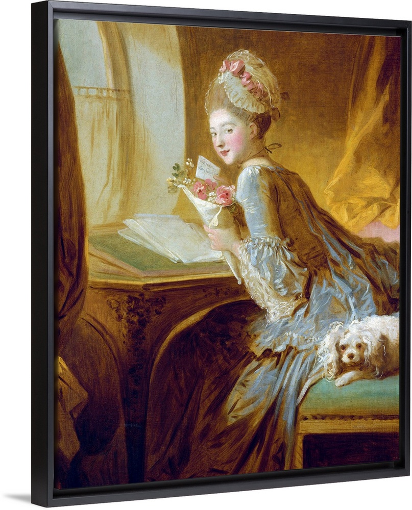 <p>In the work of Fragonard, by comparison, for example, with that of Boucher, finish is a relative term. Here, over a brown tone, Fragonard shapes the composition in darker shades of brown, drawing and modeling with the tip of the brush and with strokes of varying thickness. Color and white are confined to passages under strong light toward the center of the canvas: the young woman's powdered face, her dress and cap, writing surface and stool, flowers and dog. This famous canvas from the early 1770s should be read not as a portrait but as a genre scene.</p>